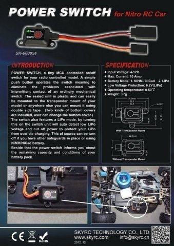 SKYRC introducerer POWER SWITCH, en lille MCU styret tænd / sluk-knap til din radiostyrede model. En simpel trykknap betjener kontakten, hvilket betyder at eliminere problemerne i forbindelse med intermitterende kontakt med en almindelig mekanisk switch. Den forseglede enhed er plastik og kan nemt monteres på transpondermonteringen på din model eller hvor som helst du kan montere den ved hjælp af dobbeltsidetape. (To slags bunddæksler er inkluderet, brugeren kan ændre bunddækslet.) Omskifteren har også en LiPo-tilstand. Ved at dreje på omskifterenheden vil den automatisk registrere lav LiPo-spænding og afbryde strømforsyningen for at beskytte din LiPo fra over dis- opladning. Dette kan selvfølgelig slukkes, hvis du har andre sikkerhedsforanstaltninger på plads eller ved brug af NiMH / NiCad-batteri. Derudover informerer strømafbryderen dig om den resterende kapacitet og betingelser for batteriet.