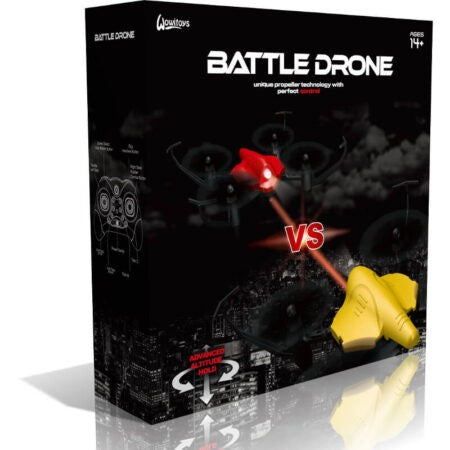 Droneflyvning er sjovt, men droneflyvninger kombineret med kamp mod dine venner er MEGA sjovt….Med dette dronesæt fra Wowitoys, får du 2 droner samt al nødvendig tilbehør, for at komme i gang med luftkrig. Der medfølger en controller til hver drone. Stabil og god for begyndere Wowitoys Battle Drone er særdeles velflyvende og er noget af det mest stabile i denne klasse. Den er nem at flyve og reagerer fuldstændig som man forventer, når man styrer med den medfølgende controller. Højde-stabiliserings funktionen hjælper piloten med at holde en konstant højde over gulvet/jorden. Dette gør dronen god for ny-begyndere og for de yngste drone-piloter. Samtidig har dronen den enestående funktion, som gør at den kan bruges i drone-krig. Dette gør dronen sjov og udfordrerne for selv den mest erfarne dronepilot. En yderligere detalje er at du kan endda også spille 4 imod 4 hvis du har to sæt. Dronerne er blå og rød. Nedkæmp din modstander, når du har din modstander foran dig, trykker du på højre stick, hvorefter et “skud” affyres. Første gang man bliver ramt, vakler dronen i luften. Anden gang man rammes roterer dronen i luften i 2-3 sekunder. Tredje gang slår dronen 2 kolbøtter i luften og fjerde gang går dronen ned i en spiral. Herefter skal man vente 2-3 sekunder, inden der kan flyves igen. Dronen er forsynet med beskyttelse af propellerne, hvilket er en stor fordel når der flyves indendørs. Drone kan selv lette & lande Funktionen “auto take-off & landing” gør det muligt at lette og lande blot ved at aktivere en knap på controlleren. Dronen har desuden Headless-mode, som er en funktion der gør det nemmere at styre dronen, uden hele tiden at skulle fokusere på dronens orientering. Når højre stick på controlleren skubbes i en retning, vil dronen bevæge sig i samme retning, uafhængigt at hvordan dronen vender. Denne funktion er specielt god for nybegyndere. Luft-akrobatik: Dronen kan, ved et enkelt tryk på controlleren, lave akrobatiske manøvre i luften. Nemt og underholdende…