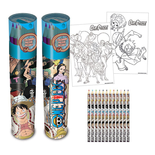 Pencil tube with 12 colouring pencils, 2 colouring posters and 1 sharpener built into the tube lid.
