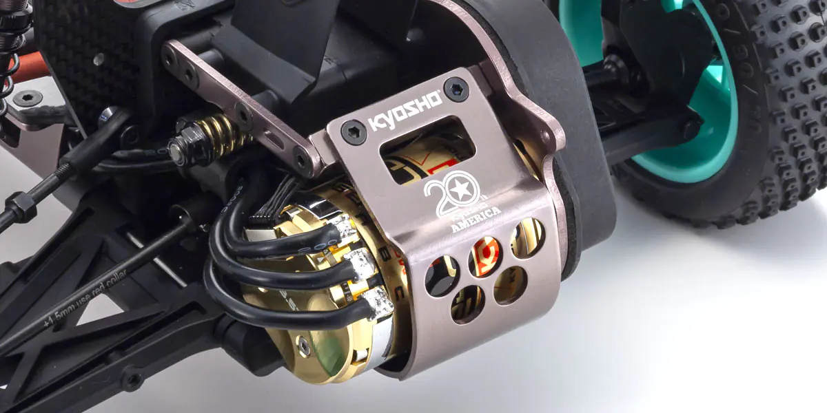Engraved with a logo commemorating Kyosho America’s 20th anniversary, the aluminum motor guard is also finished in gunmetal and protects the motor from crash damage.