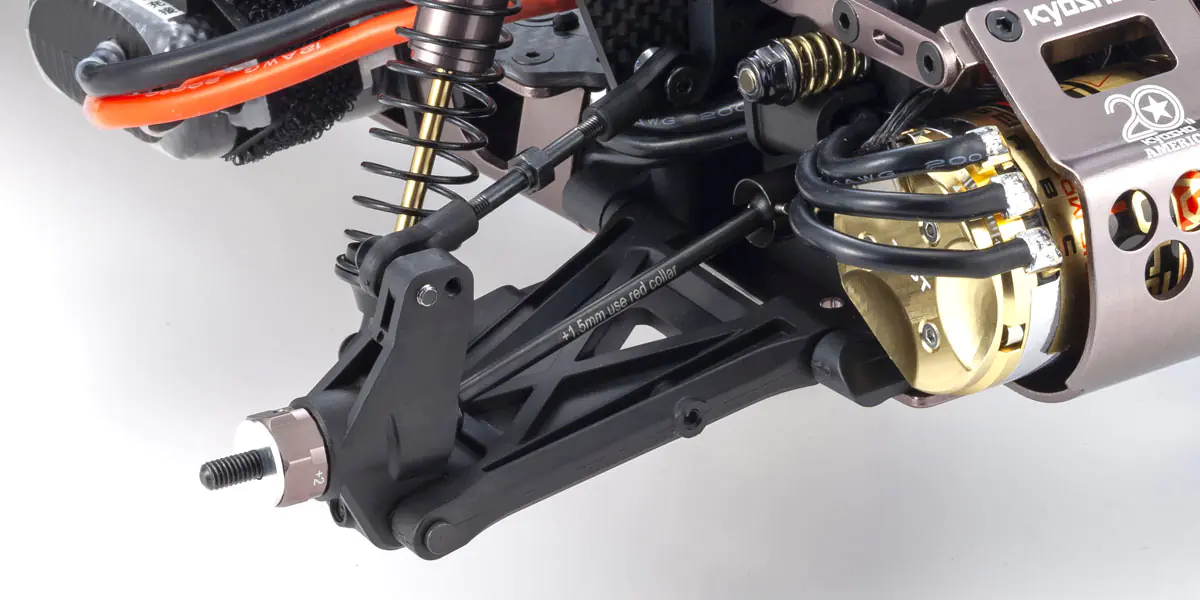 Large capacity oil shocks feature titanium coated shafts for smooth function and durability plus dial adjustable chassis height. Shock caps and cases are finished in the Kyosho Works signature gunmetal color.