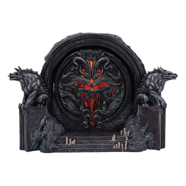 Unleash the darkness with the Diablo IV Hells Gate Box, a must have for gaming enthusiasts and collectors. This intricately crafted piece features the iconic Hells Gate from the game, guarded by two skeletal wolf statues and framed by four ominous steps leading up to the foreboding gate doors. Opening the doors reveals a hidden compartment, perfect for storing chesriched trinkets. Packaged in a stunning Nemesis Now DIablo iV branded gift box, the Hells Gate Box is not only a delightful collectible but also a perfect gift.