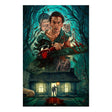 When demons descend on a remote, rustic cabin, Ash Williams gets a literal hell of a lot more than he bargained for thanks to the Book of the Dead. With his chainsaw in hand (or in place of a hand), he's ready to mow down the masses of Deadites intent on possessing his soul. Ash and Annie Knowby stand center stage in the cabin doorway, beset from all sides by Evil Ash, Henrietta, and even the trees themselves. This detailed illustration captures all of the blood-soaked action of the iconic film, with references from the tape recorder to Linda's necklace lurking in the woods ... Groovy.