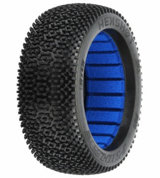 This is a pair of Hex Shot 1/8 Buggy Tires. Introducing the Hex Shot 1/8 Buggy race tire, a stepped-pin tire designed to tackle loose and loamy tracks. Beefy pins are arranged in rows of hexagon-shaped pods down the center of the tire, while the smaller outer tread is made up of connected chains of pins. The step-pin design helps support the tall pins while your buggy carves through loose dirt, providing excellent forward grip and braking stability.The Hex Shot is made with Pro-Line's latest generation carcass shape for improved bump handling, while the large pin design gives you the longevity for main events. Don't get caught spinning your tires in the dirt, be the first at your track to win with Pro-Line's Hex Shot!