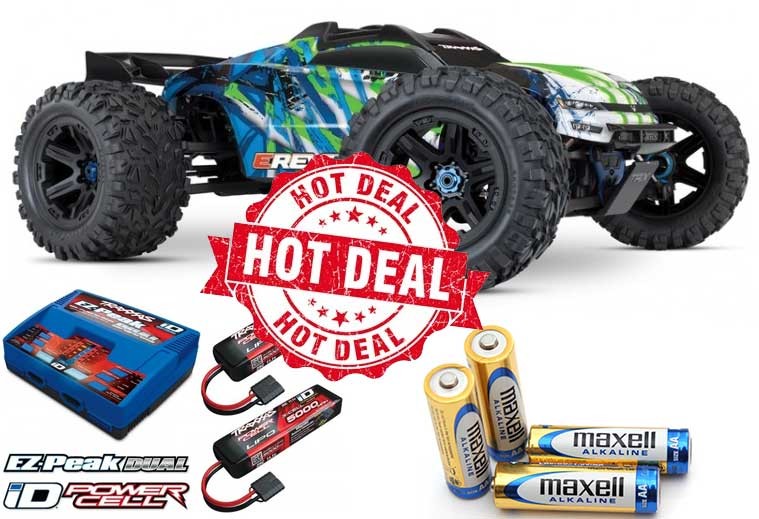 Særligt pakketilbud med E-REVO 2.0 Brushless 4WD TQi TSM 86086-4 inkl. Kombo-pakke LiPo 11,1 x 2 + lader TRX2990 og 4 styk AA-batterier.