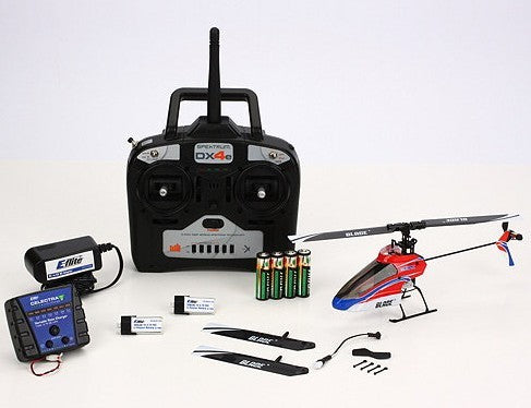 It comes out of the box 100% factory built and equipped with a factory-installed Flybarless 3-in-1 Control Unit with Spektrum 2.4GHz DSM2 receiver, ESCs, and gyros. Comes with 2.4GHz DSM2 transmitter and two 1S 200mAh 30C batteries, single port charger with AC adapter and a 1S High Current Ultra-Micro Battery Adapter Lead.