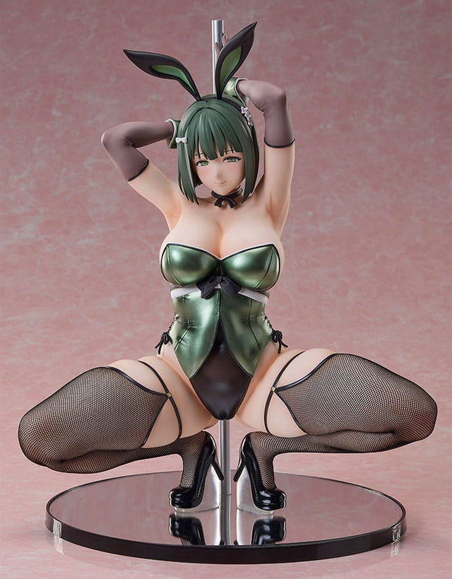 Her voluptuous body is wrapped in a refined and elegant green bunny suit,