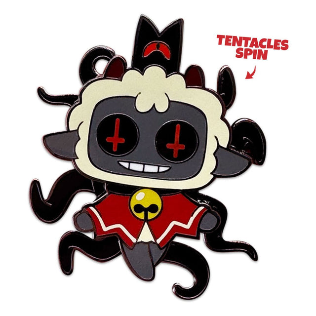 The Lamb is here to seduce you to a world of sin with their new pin! At 2 inches tall with a shiny, high-quality finish, this pin sees the Lamb levitating with their hands reaching out welcomingly, as a sinister grin stretches underneath black eyes that have inverted red crosses, while the black tendrils attached to their back spin around hypnotically. Perfect as decoration on a cork board or showing off on your tote bag, backpack, fanny pack, jacket or wherever your heart desires, this pin is sure to turn heads and catch the eyes of anyone you pass, letting them know who's ready to succumb!