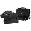 It features 3 foam inserts to safely store and protect your miniatures: one insert with 12 compartments for miniatures with a wide base, another insert with 13 compartments for miniatures with a wide base and different compartment sizes, and a removable 60 mm insert for larger or irregular models/tanks.