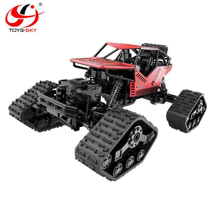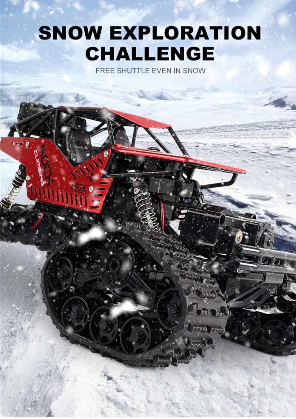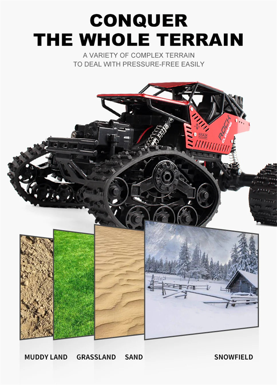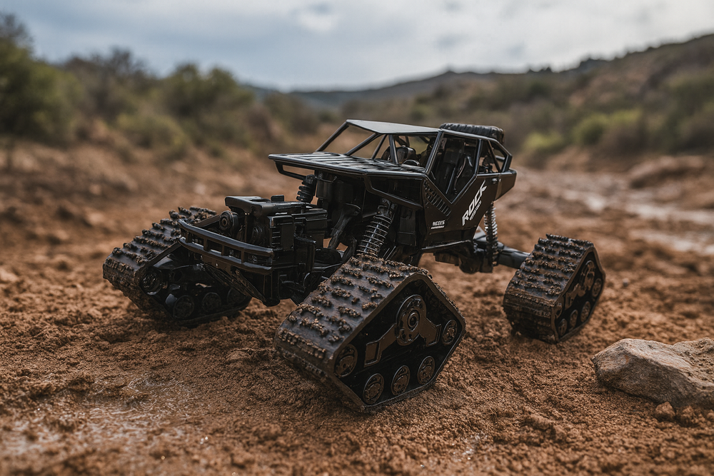 Med både udskiftelige hjul og gummibælter kan du tilpasse bilen til enhver overflade – fra sand og sne til stenede stier. Den robuste konstruktion, affjedring og firehjulstræk giver fremragende greb og stabilitet, så du altid er klar til nye udfordringer.