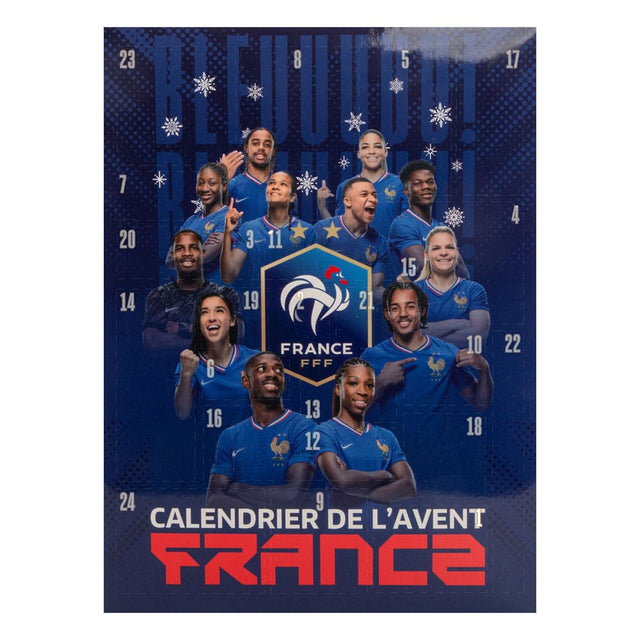 Officially licensed advent calendar with 24 French Football Federation themed gift items (Mini squishy, shoes lace, acrylic bookmark, foldable water bottle, wrist balloon, acrylic stand, woven patch, rubber keychain, microfiber cloth, kids stamp, magnet, bucket hat, memo pad, pin, paper pen holder, luggage tag, washi tape, socks, drawstring pouch, lanyard, eraser, sleeping mask, pen, laser sticker)