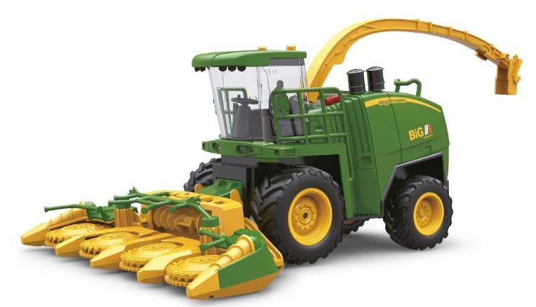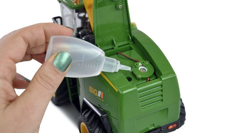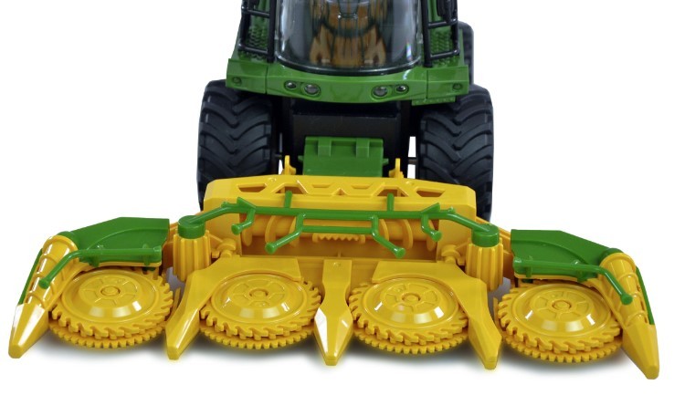Ekstra-smart er det 4-rækket majsskærebord som høsttilbehør, hvis snittemekanisme roterer under brug i marken, hvilket simulerer skæringen af stilke fra den virkelige verden. BONUS: De to yderste rækker kan foldes op manuelt, og høstudstyret kan hæves helt – de gældende færdselsregler overholdes så ved vejkørsel. Takket være kugleleddet kan udkasterrøret, som er omkring 25 cm langt, manuelt drejes 360 grader på midten. På denne måde kan udledning af hakket materiale på en transporttrailer eller en transfervogn igen gøre legen ekstra virkeligt.