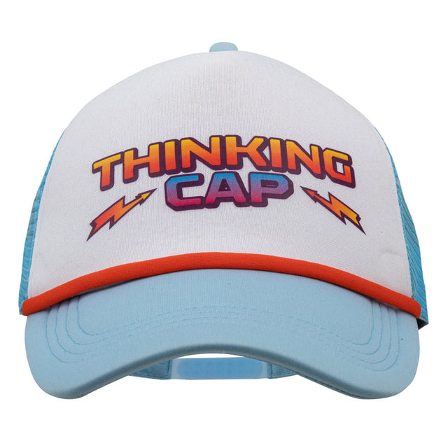 This trucker-style hat boasts a charming color palette of light blue and white accents, infusing a touch of retro appeal into the cap. Become part of Dustin's dedicated fan base and make a bold statement with Dustin's Thinking Cap.