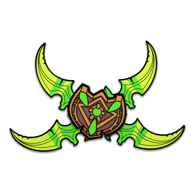 Illidan is on vacay and lent us his Warglaives to sharpen in the meantime! At 2 inches wide with a shiny, high quality finish, this pin is designed with the two vibrant green Warglaives attached at the centre by an axis so they can spin around viciously! This pin is perfect as decoration on a cork board or showing off on your tote bag, backpack, fanny pack, jacket or wherever your heart desires, these pins are sure to turn heads and catch the eyes of anyone you pass, letting them know just who's ready for battle!